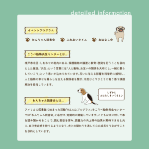 アメリカの図書館で始まった活動「R.E.A.D.プログラム」をこうべ動物共生センターでは「わんちゃん読書会」と名付け、定期的に開催しています。こどもが犬に対して本を読み聞かせることで、読む意欲を育み、読書力の向上等の効果が期待できると共に、自己肯定感を持てるようになり、犬との関わりを通して心の成長をうながすことを目的としています。