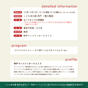 イタリアでうまれた楽器“マンドリン”による温かく美しい音色のクリスマスミュージックと、こども本の森 神戸のスタッフによるクリスマス絵本の読み聞かせを予定しています。