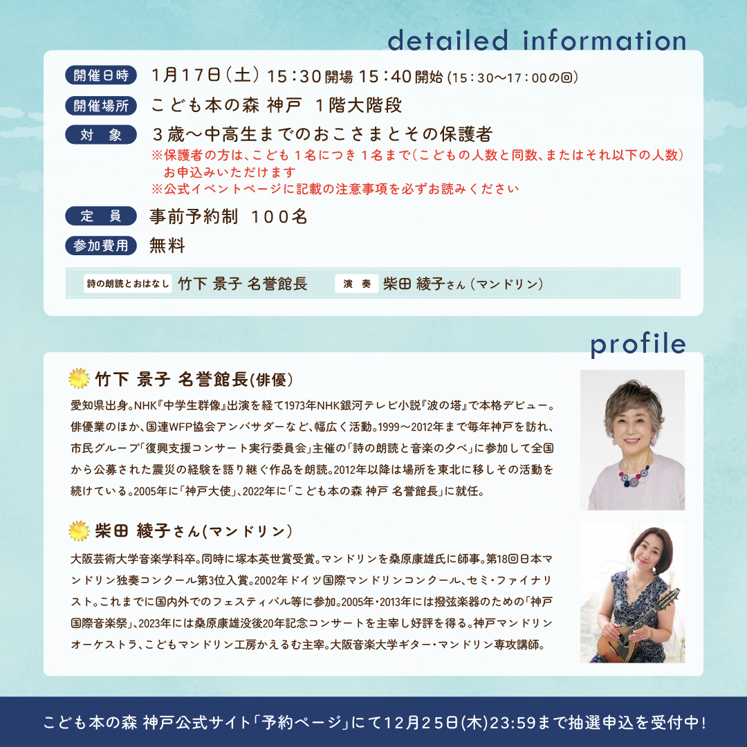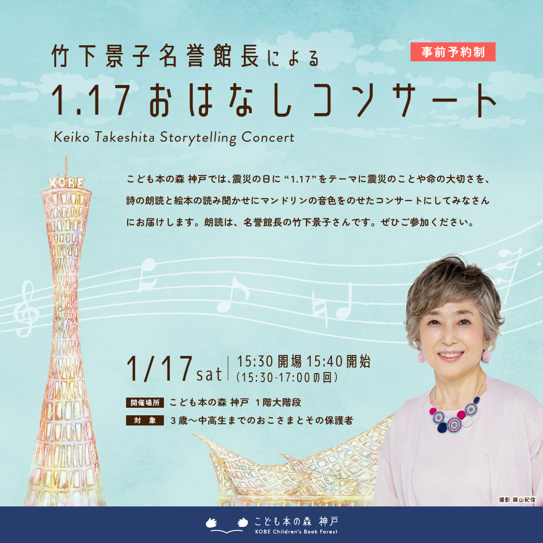こども本の森 神戸では、震災の日に “1.17”をテーマに震災のことや命の大切さを、詩の朗読と絵本の読み聞かせにマンドリンの音色をのせたコンサートにしてみなさんにお届けします。朗読は、名誉館長の竹下景子さんです。ぜひご参加ください。