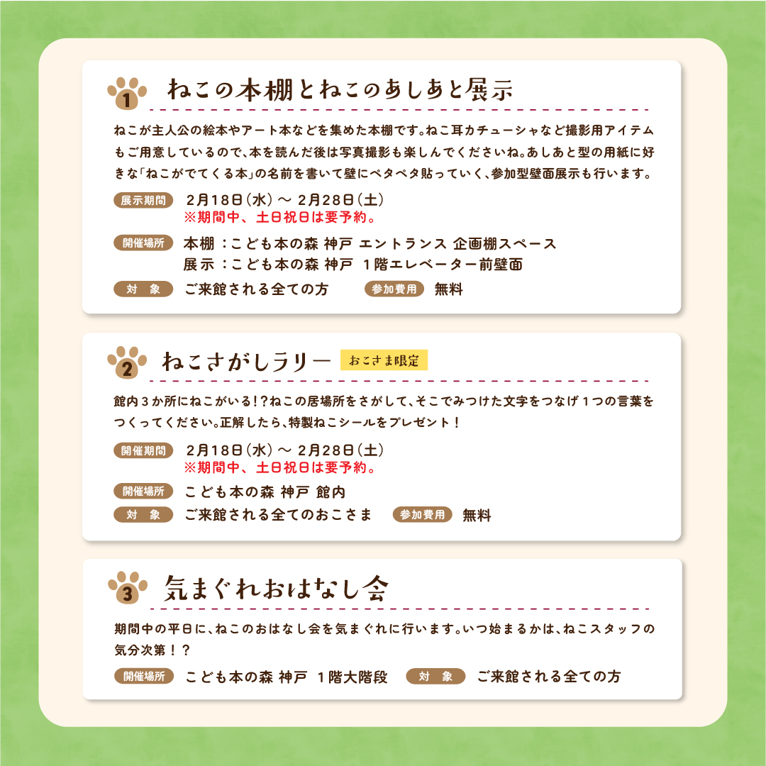 期間中の平日に、ねこのおはなし会を気まぐれに行います。いつ始まるかは、ねこスタッフの気分次第!?