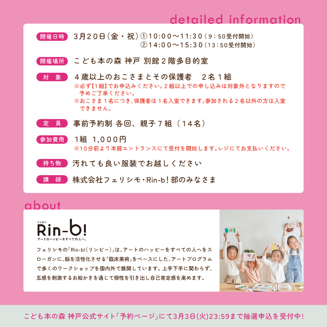フェリシモの「Rin-b!(リンビー)」は、アートのハッピーをすべての人へをスローガンに、脳を活性化させる「臨床美術」をベースにした、アートプログラムで多くのワークショップを国内外で展開しています。 上手下手に関わらず、五感を刺激するお絵かきを通じて個性を引き出し自己肯定感を高めます。